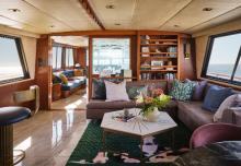 Guests board via the Aft Salon, a plush entertaining space with a large expandable butterfly cocktail table, curved banquette, radiant-heated tile floors, wet bar, and wing doors to port and starboard side decks. The custom curved banquette with vertical channel tufting was carefully removed and fully restored with a breathtaking "Prussian Blue" performance outdoor velvet. A playful faux tiger Feroz rug anchors the vintage burled mahogany coffee tables. Pillows incorporate classic rope knot patterns and contrasting gold/blue velvet color schemes. Subtle details such as the Art Deco style wall covering in the Day Head and 3-D printed plant polymer lamp by Gantri were influenced by the client’s love of Art Deco architecture.