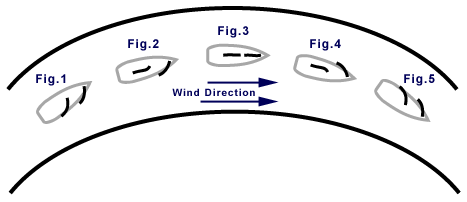 Figure 3. As the boat turns further, the wind crosses to the other side. The sails are carefully eased out to their proper position for the new heading in Figures 4 and 5.